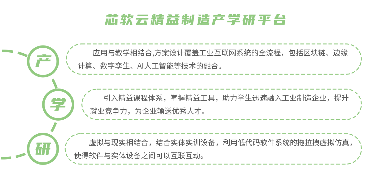 應(yīng)用與教學(xué)相結(jié)合,方案設(shè)計(jì)覆蓋工業(yè)互聯(lián)網(wǎng)系統(tǒng)的全流程,包括區(qū)塊鏈、邊緣計(jì)算、數(shù)字孿生、AI人工智能等部分的融合。引入精益的課程體系,學(xué)習(xí)精益工具,助力學(xué)生迅速融入工業(yè)制造企業(yè),提升就業(yè)競(jìng)爭(zhēng)力,為企業(yè)輸送優(yōu)秀人才。虛擬與現(xiàn)實(shí)相結(jié)合,結(jié)合實(shí)體實(shí)訓(xùn)設(shè)備,利用低代碼軟件系統(tǒng)的拖拉拽虛擬仿真,使得軟件與實(shí)體設(shè)備之間可以互聯(lián)互動(dòng)。